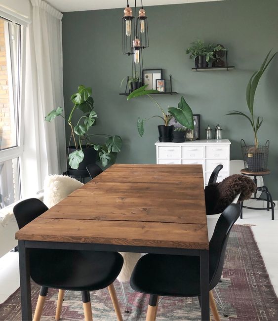 Сполучення зеленого кольору в будь-яких відтінках з деревними тонами і текстурами – це безпрограшний варіант. При цьому відтінки дерева можуть бути світлими, темними, з червоними відливами або тональними переходами в кольорах шоколаду. Всі вони будуть виглядати гармонійно.