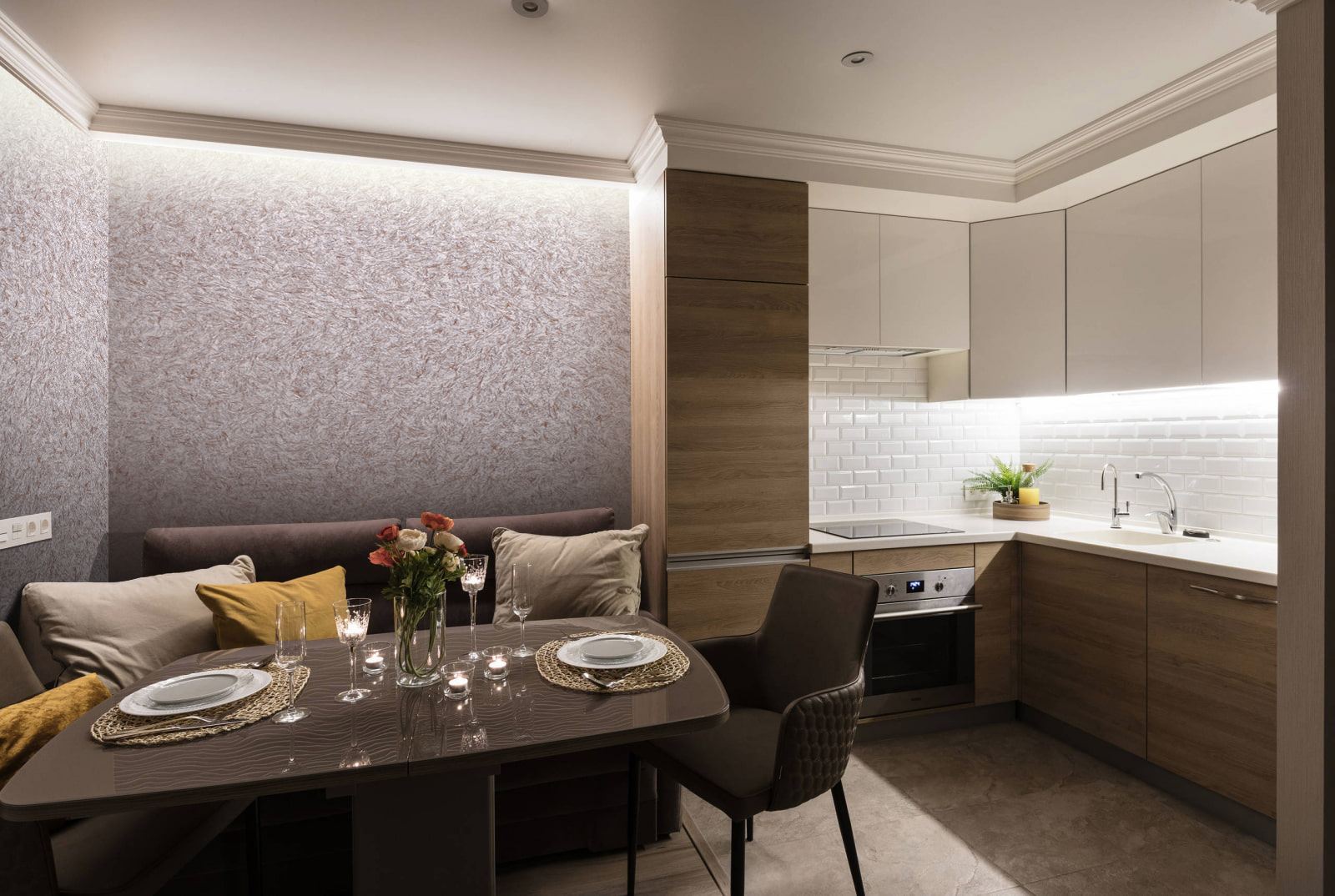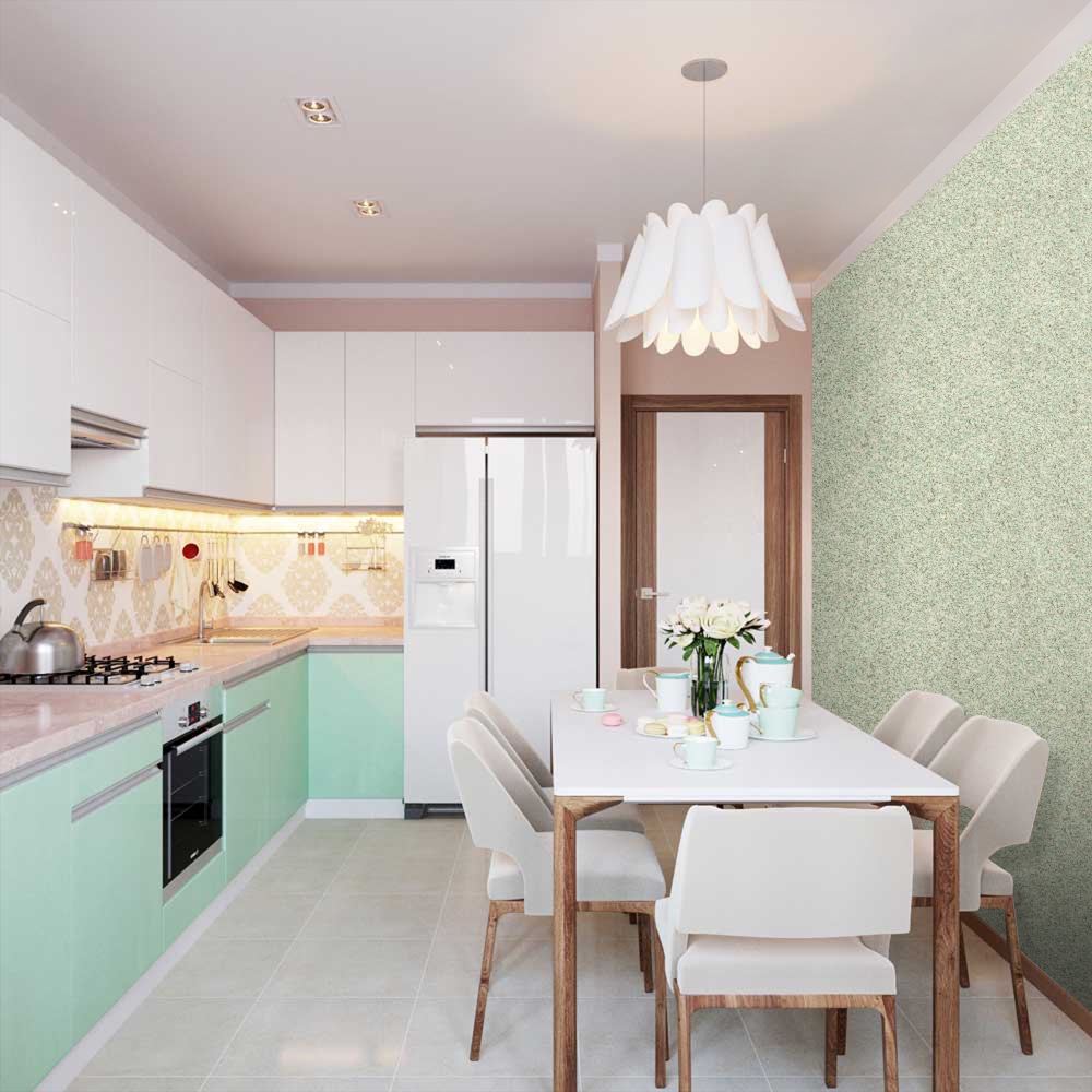 У передпокої кращі світлі тони. А ось інтер'єр кухні рідкими шпалерами може бути більш насичений кольором. Тут підійдуть навіть такі сміливі рішення, як морська хвиля, фуксія або графіт. Тільки використовуйте додаткові джерела освітлення, щоб обробка не здавалася похмурою.